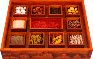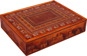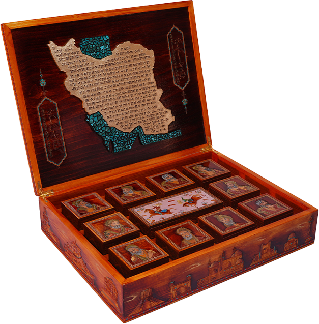 هر یک از ۱۱ جعبه چوبی داخلی، حاوی یکی از محصولات بومی و سنتی استانهای مختلف ایران است: